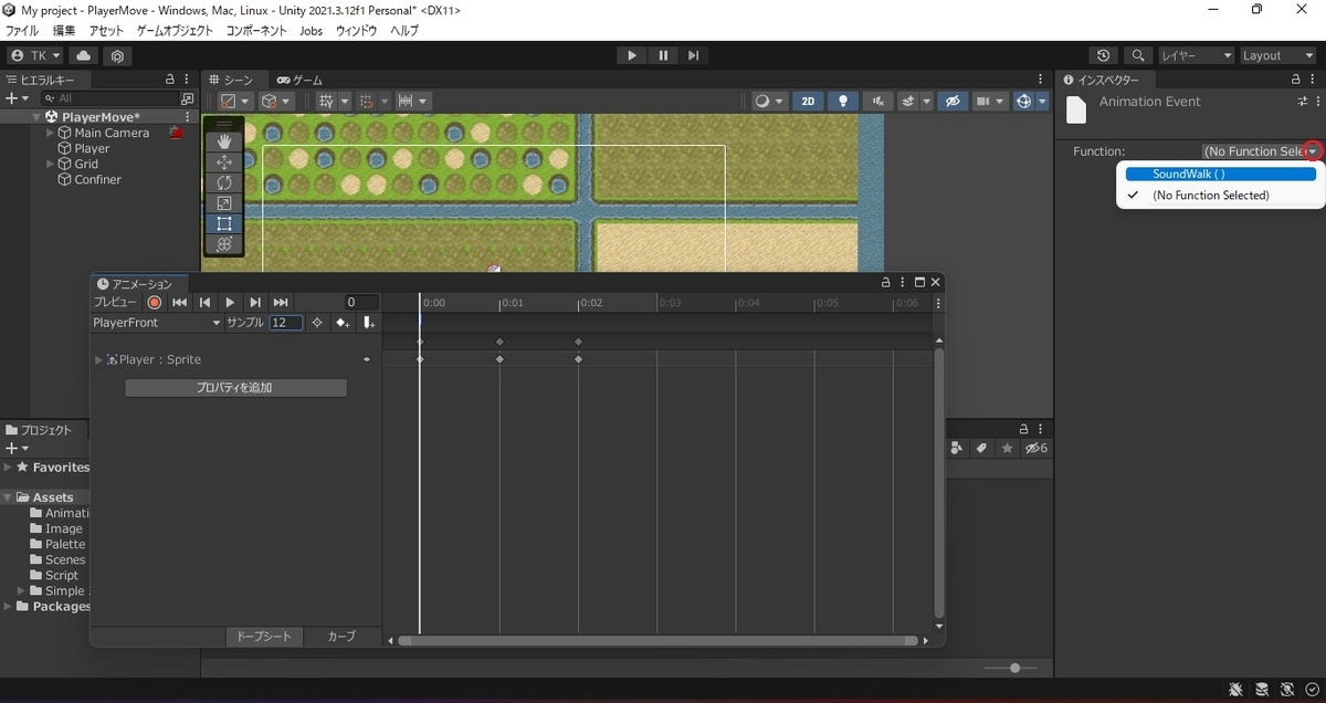 10.インスペクターのFunctionにSoundWalk()を設定